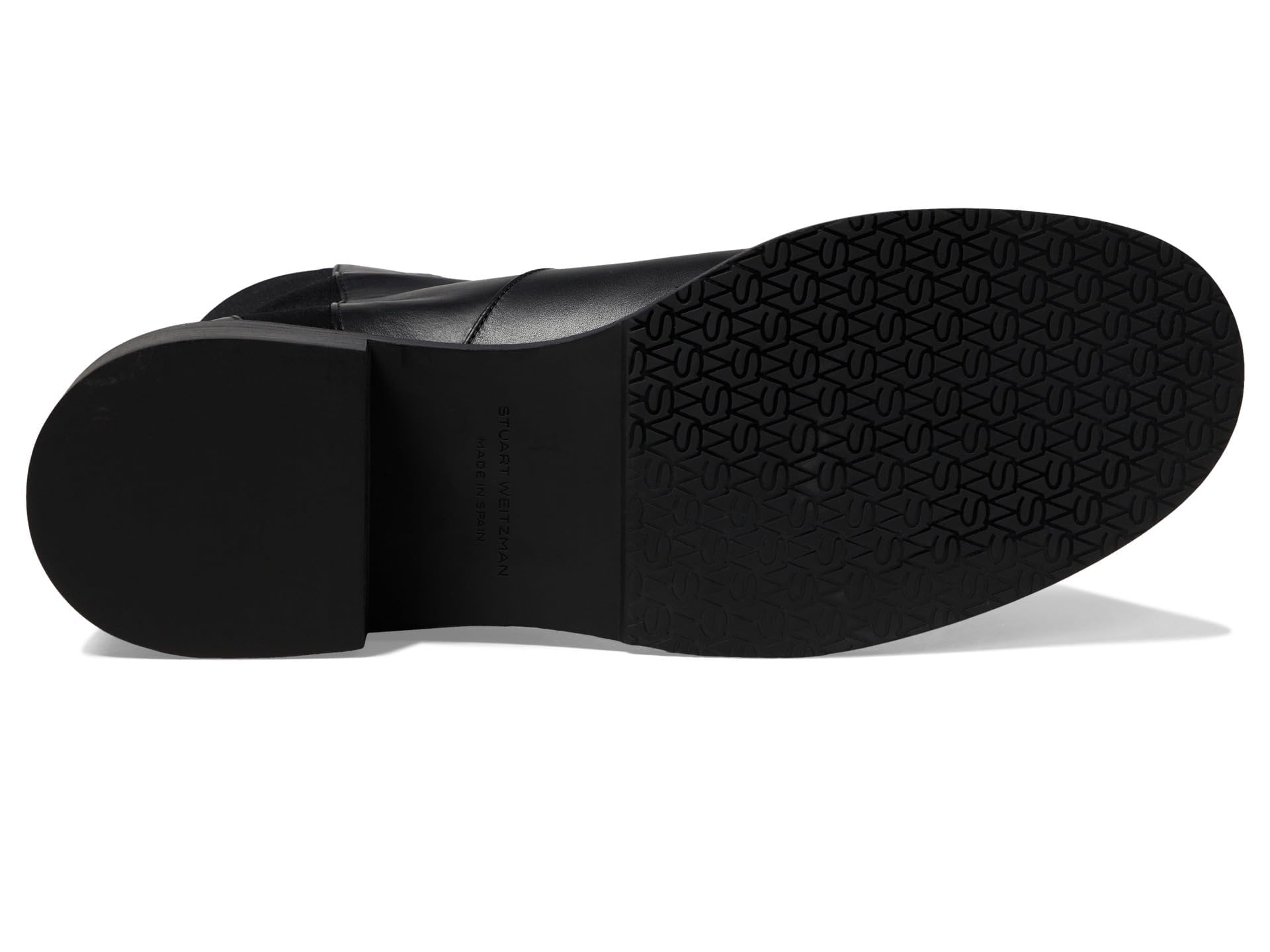 Details: Get an edgy style and enjoy premium comfort all day long as you walk in the Stuart Weitzman 5050 Bold Booties. This sleek and sophisticated pair of ankle boots are constructed with a supple leather upper paired with a contrasting microstretch back design that allows for an easy pull-on style. Incorporated with leather and textile lining and insole, the boots are comfy enough to wear season after season. Round toe. Stacked block heel. Durable and flexible synthetic outsole. Made in Spain.