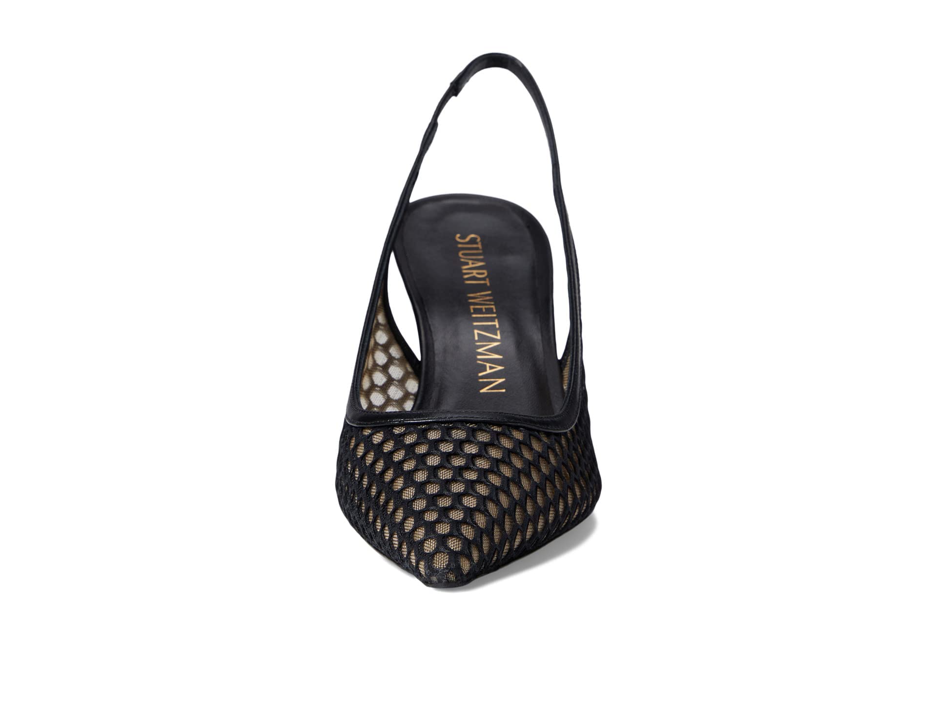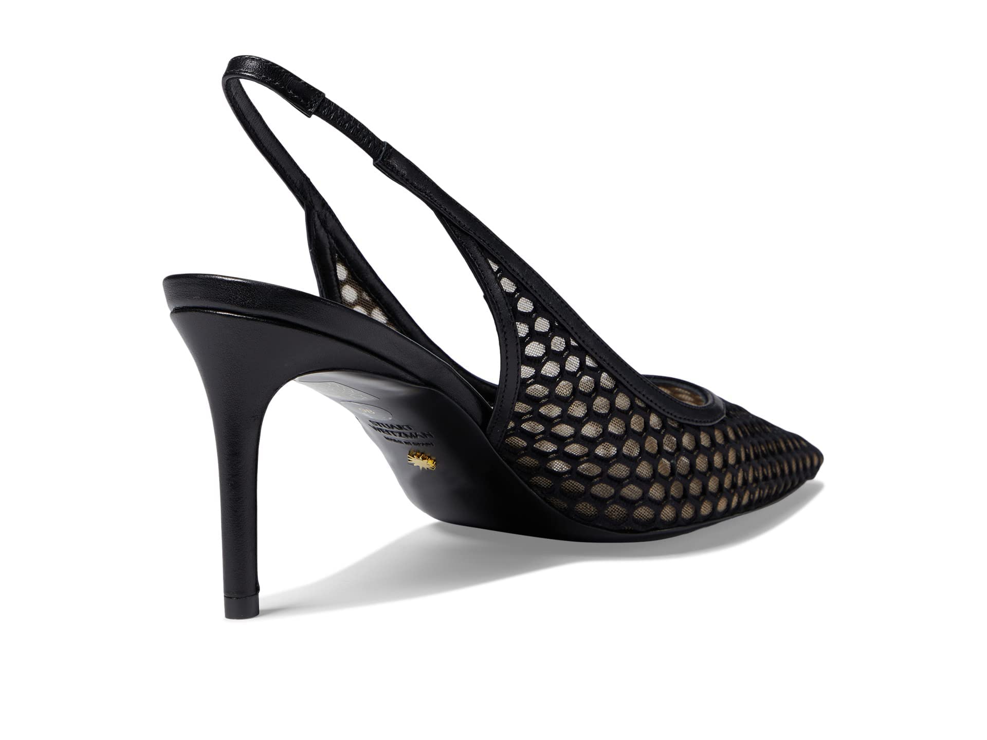 Glam up the party to the fullest wearing Stuart Weitzman 75 Slingback Pump heels. Calf leather upper and lining. Calf leather insole. Elasticized slingback closure. Stiletto heel. Brand name embossed on the footbed. Pointed toe. Calf leather outsole. Imported.