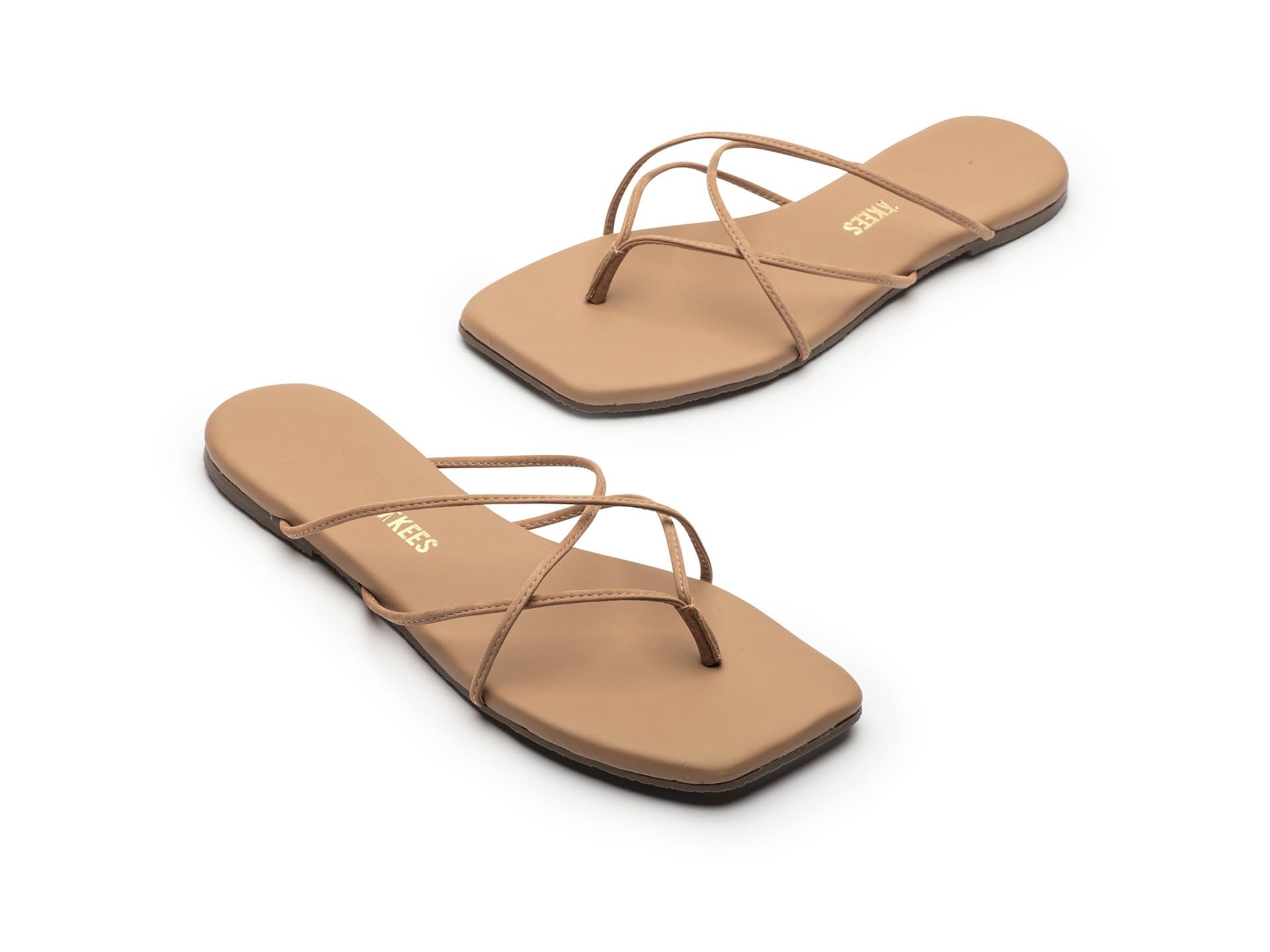 Experience the ultimate relaxation with these comfortable and snug-fit TKEES Square Toe Elle slippers for pure bliss. It has bovine leather upper, footbed, and midsole construction. This square toe silhouette toe post design slip-on has rubber outsole. Made in Brazil.