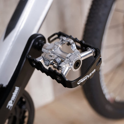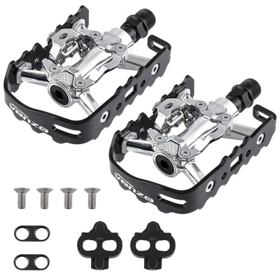 VERSATILE & COMPATIBILITY: By blending comfort and performance together, we've created an amazingly versatile shoe that is perfect for MTB off road riding, commuting, touring, and spin class. The cleat area is compatible with all Shimano SPD pedal systems & Crankbrother System. SHOES: Features the award- winning technology for performance. Quick-drying, highly-breathable mesh and synthetic upper. Textile lining with removable sockliner. Low cut construction for a light, fast fit feeling. Flexible forefoot and a running shoe beveled heel.Stiff sole for a better force transfer. PEDALS: Axle: 9/16" CNC machined Cr-Mo. Body: Die-cast aluminum Bearing: LSL bushing & sealed, Binding: Dual- sided Cr-Mo, Tension adjustable (80~140kgf.cm) Weight: 368 g/pr = 0.81 lbs. (without cleats) FRIENDLY REMINDER: Please do not use these on spin bike as it requires extra heavy duty pedals. CLEATS: Shimano SPD Type Cleats SC-C01F Included, Size: 105 x 66 mm = 4.13 x 2.6 inch, Single direction release only. Note: Please practice on how to release off the pedals before riding! PREMIUM QUALITY - This is a combination set that comes a pair of shoes, a pair of pedals and a pair of single direction release cleats. Riding with high quality shoes and pedals to avoid injury.