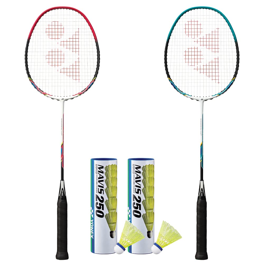 Details: Perfect for a game of badminton at the beach, park or in the backyard, this badminton set from Yonex. Includes two Yonex badminton racquets and two tubes of Yonex MAVIS 250 Yellow/ Medium shuttlecocks. Combo set made for quick and temporary use.